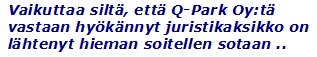 On hienoa, että Q-Park kantaa tällä tavoin yhteiskuntavastuutaan ja välttelee omaksi vahingokseen oikeudenkäyntejä sen vuoksi, että yhteiskunta ei ole tällaiseen vielä valmis! Tämähän on lähes yhtä pyyteetöntä uhrautumista yksityisen voittoa tavoittelevan yrityksen taholta kuin velkomuskanteiden laajamittaisesta nostamisesta pidättyminen vuonna 2007, joka johtui ainoastaan yksityistä pysäköinninvalvontaa harjoittavien yritysten halusta välttää alioikeuksien työmäärän lisääntymistä. Näin ainakin, jos kansanedustaja Sampsa Katajan kirjalliseen kysymykseen KK 339/2007 vp on uskominen. Voisikohan jossain esittää Q-Parkille jonkinlaisen tunnustuksen myöntämistä valtiovallan taholta näinkin pyyteettömästä ja uhrautuvasta yhteiskunnan kokonaisedun tavoittelusta yrityksen oman edun kustannuksella?